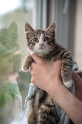 -Жужик — нежный, с огромными глазами котёнок. Ему 3 месяца. Лоток освоил сразу же. Обожает покушать.