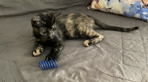 Трехцветная черепаховая Искра и ее брат оказались на улице в мае 2025 совсем крошечными.